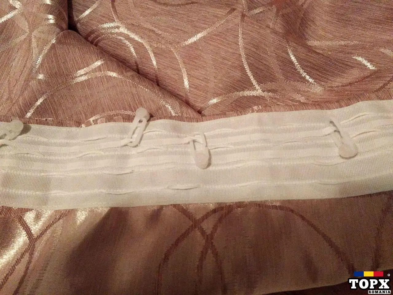 Draperie cusută cu rejansă si agătători, tivuită pe margini.